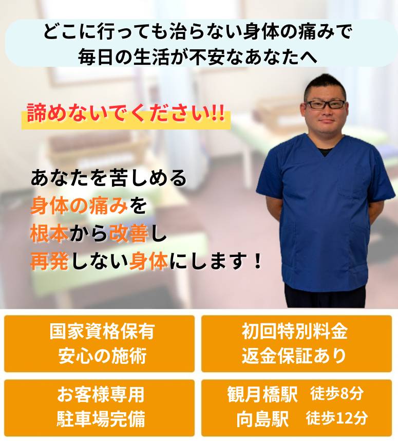 最前線の知識と多くの施術経験を持ち、症状の改善実績も豊富なカラダの専門家があなたの症状に真正面から向き合う当院で、もう二度とその痛みや不調を我慢することのなく、明るい毎日を送れるお身体を手に入れる道。