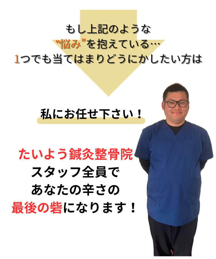迷いなく「NO!」と即答できたのであれば、今すぐ「たいよう鍼灸整骨院」へご連絡ください。